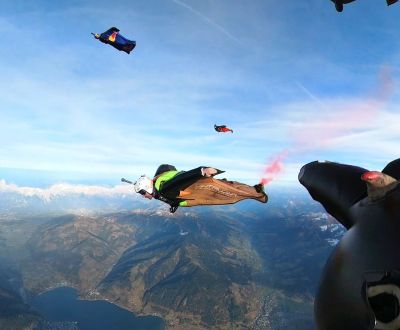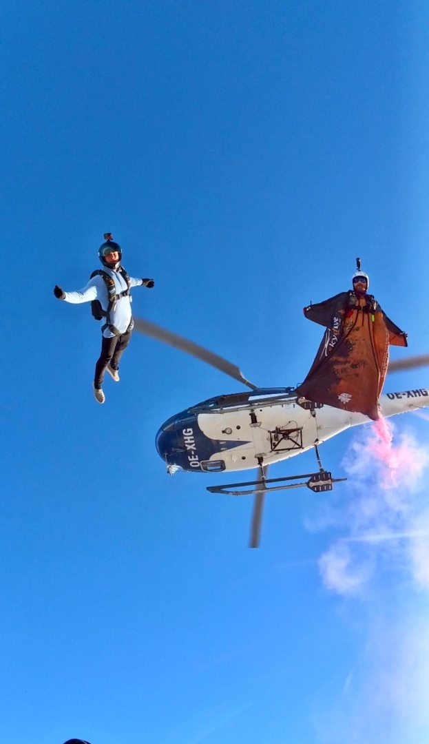 Video- und Bildwerbung präsentieren Sie in der Luft oder Boden in Form von Wingsuit, Fallschirm,Gurtzeug oder Sprunggewand. Blue Sky